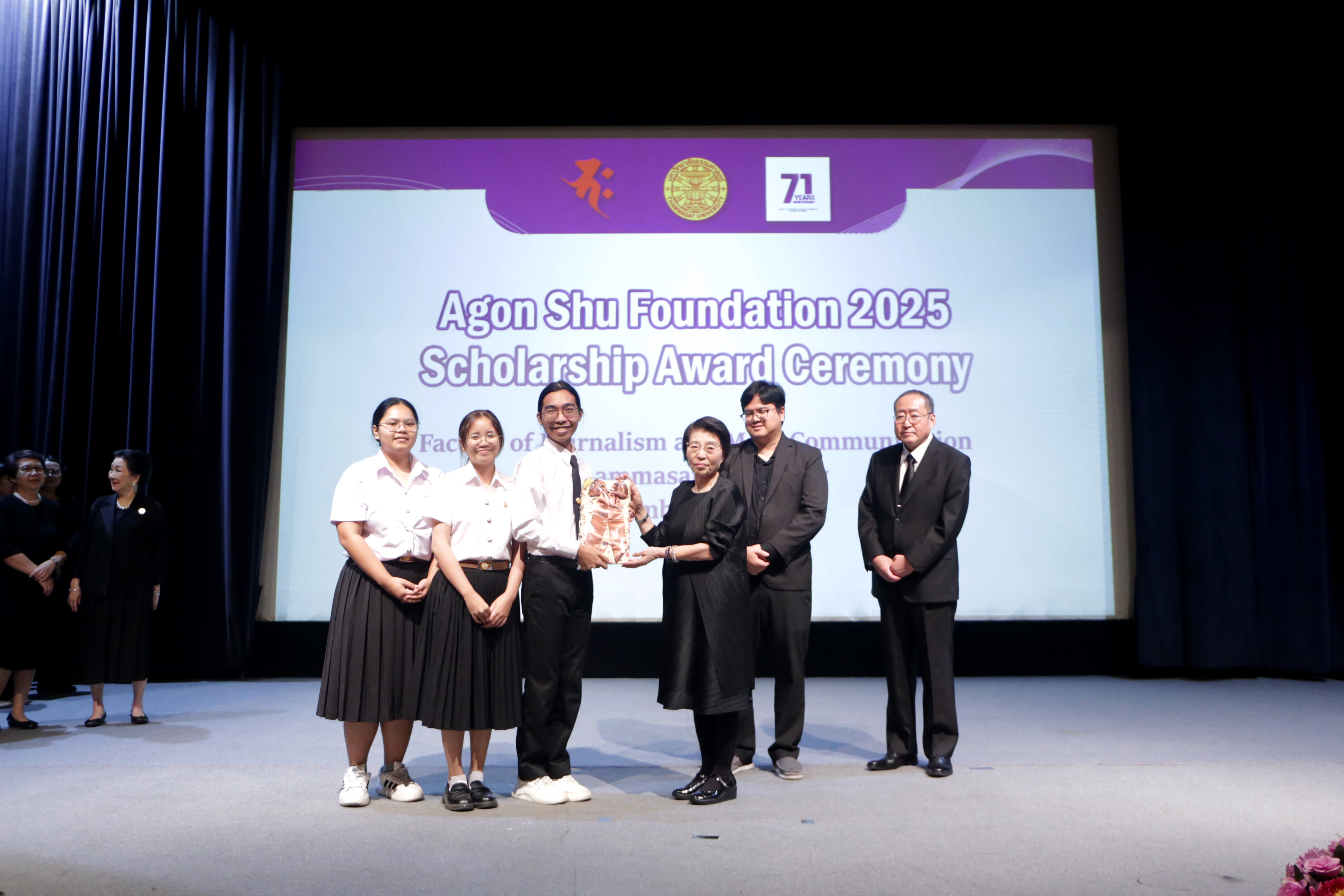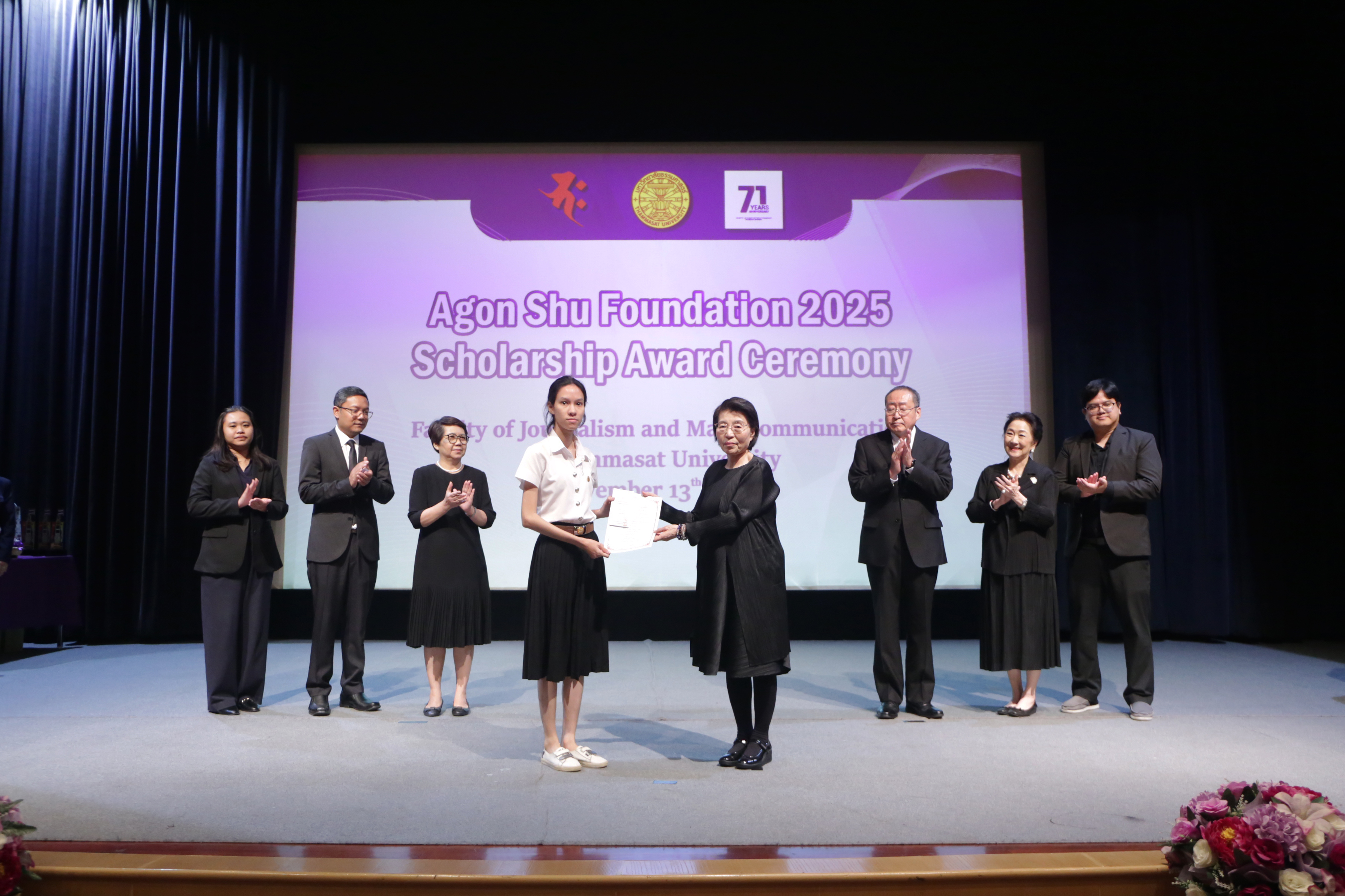 เมื่อวันที่ 13 พฤศจิกายน 2568 คณะวารสารศาสตร์และสื่อสารมวลชน มหาวิทยาลัยธรรมศาสตร์ จัดพิธีมอบทุนการศึกษา “มูลนิธิ Agon Shu” ประจำปีการศึกษา 2568 โดยได้รับเกียรติจาก Ms. Kazuko Maki, Director of Agon Shu International Department, Mr.Shimabukuro Masaru/Agon Shu Foundation, International Affairs และคุณผาณิต พูนศิริวงศ์ Agon Shu Coordinator พร้อมด้วย รศ.ดร.กิตติวัฒน์ จันทร์แจ่มใส รองอธิการบดีฝ่ายบริหารศูนย์ลำปางและการนักศึกษา ผู้แทนอธิการบดีมหาวิทยาลัยธรรมศาสตร์ กล่าวต้อนรับ โดยมี ผศ.ดร.ปกป้อง ส่องเมือง ผู้ประสานงาน มูลนิธิ Agon Shu ศ.ดร.สมคิด เลิศไพฑูรย์ อดีตอธิการบดีฯ ผศ.ดร.อัจฉรา ปัณฑรานุวงศ์ คณบดีคณะวารสารศาสตร์ฯ คณะผู้บริหาร คณาจารย์ และนักศึกษา เข้าร่วมงาน ณ โรงภาพยนตร์วารสารศาสตร์ คณะวารสารศาสตร์และสื่อสารมวลชน มหาวิทยาลัยธรรมศาสตร์ โดยในปีนี้ มีนักศึกษาจากคณะวารสารศาสตร์ฯ ได้รับทุนการศึกษาจากทางมูลนิธิ Agon Shu จำนวน 21 ทุน รวมเป็นเงินจำนวน 500,000 บาท จากจำนวนผู้สมัครขอรับทุนการศึกษาทั้งหมด จำนวน 63 คน