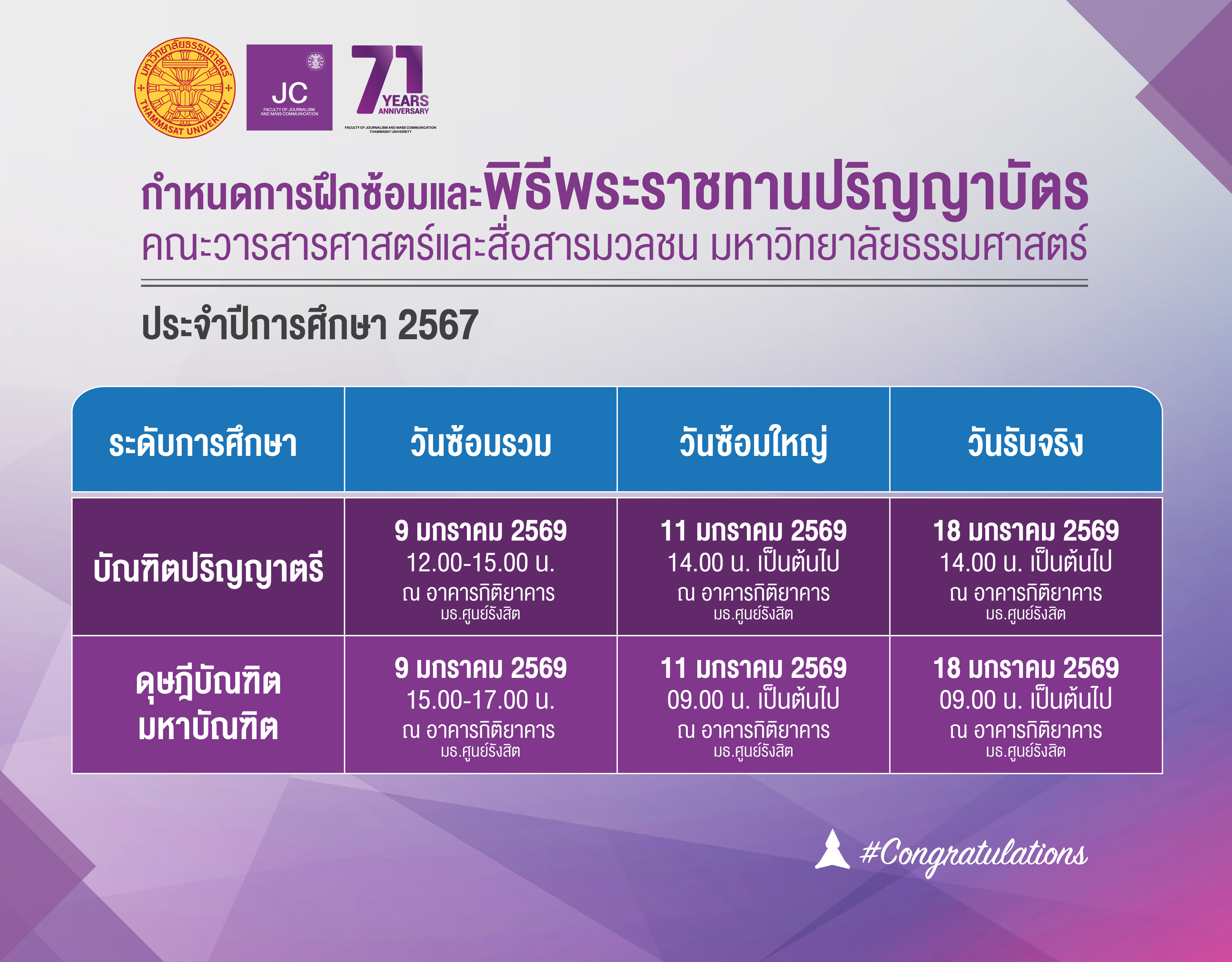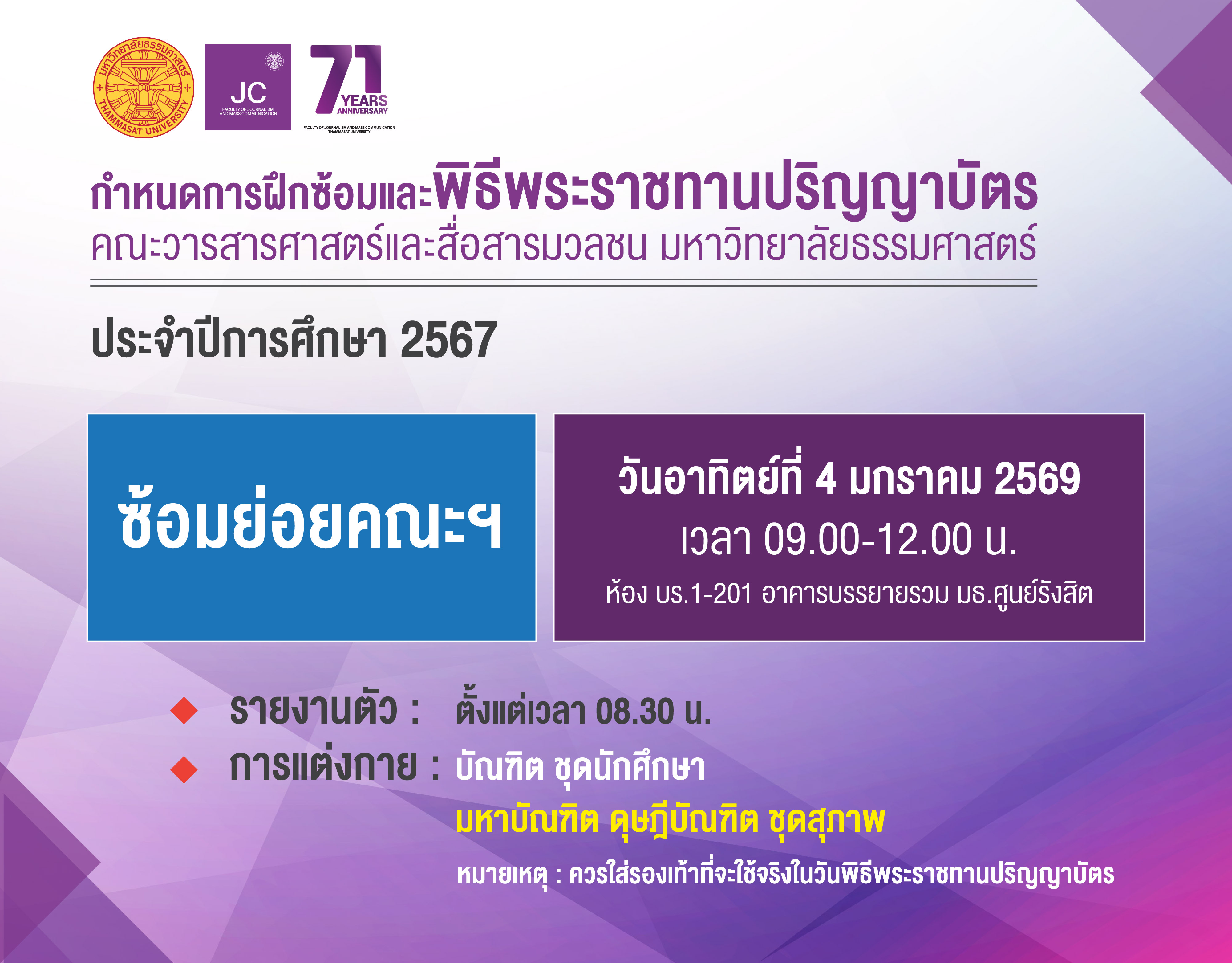 ซ้อมใหญ่ วันอาทิตย์ที่ 11 มกราคม 2569 เวลา 09.00 น. เข้ากิติยาคาร  (รอแจ้งเวลานัดหมายรวมตัวบัณฑิต)