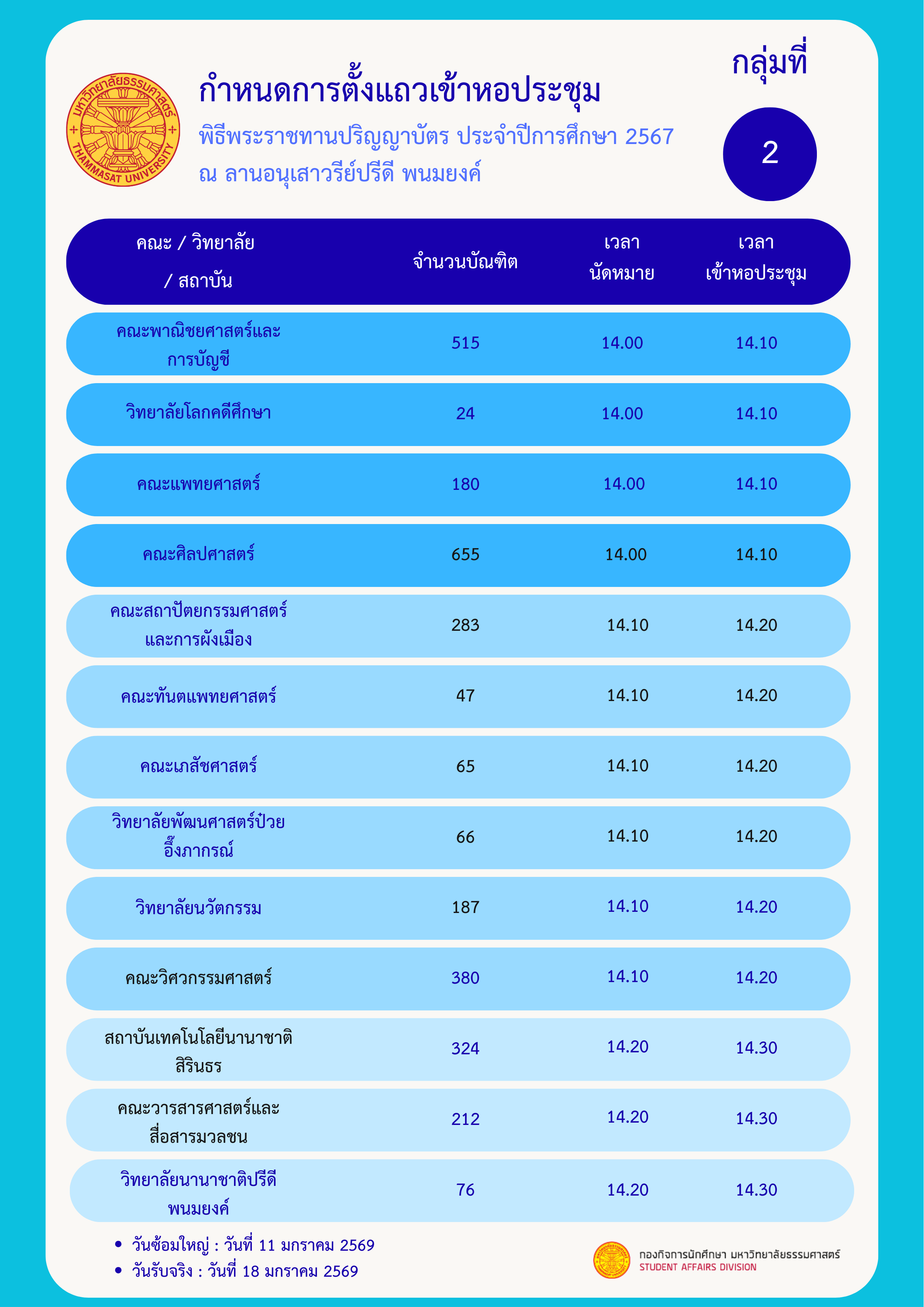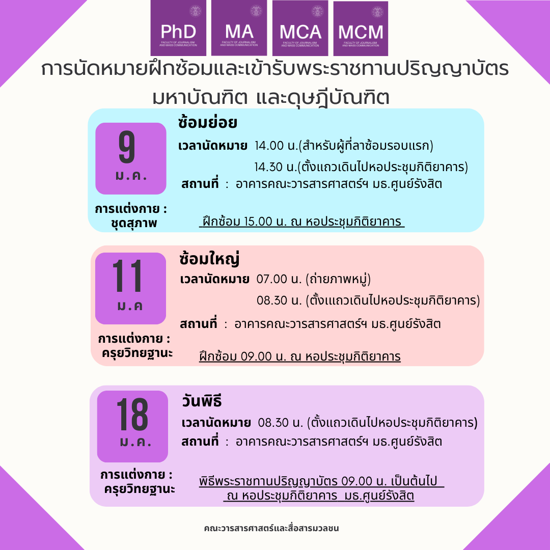 สามารถติดต่อขอรับใบปริญญาบัตรที่สำนักงานทะเบียนฯ ศูนย์รังสิต ได้ตั้งเเต่วันที่ 2 ก.พ. 69 เป็นต้นไป