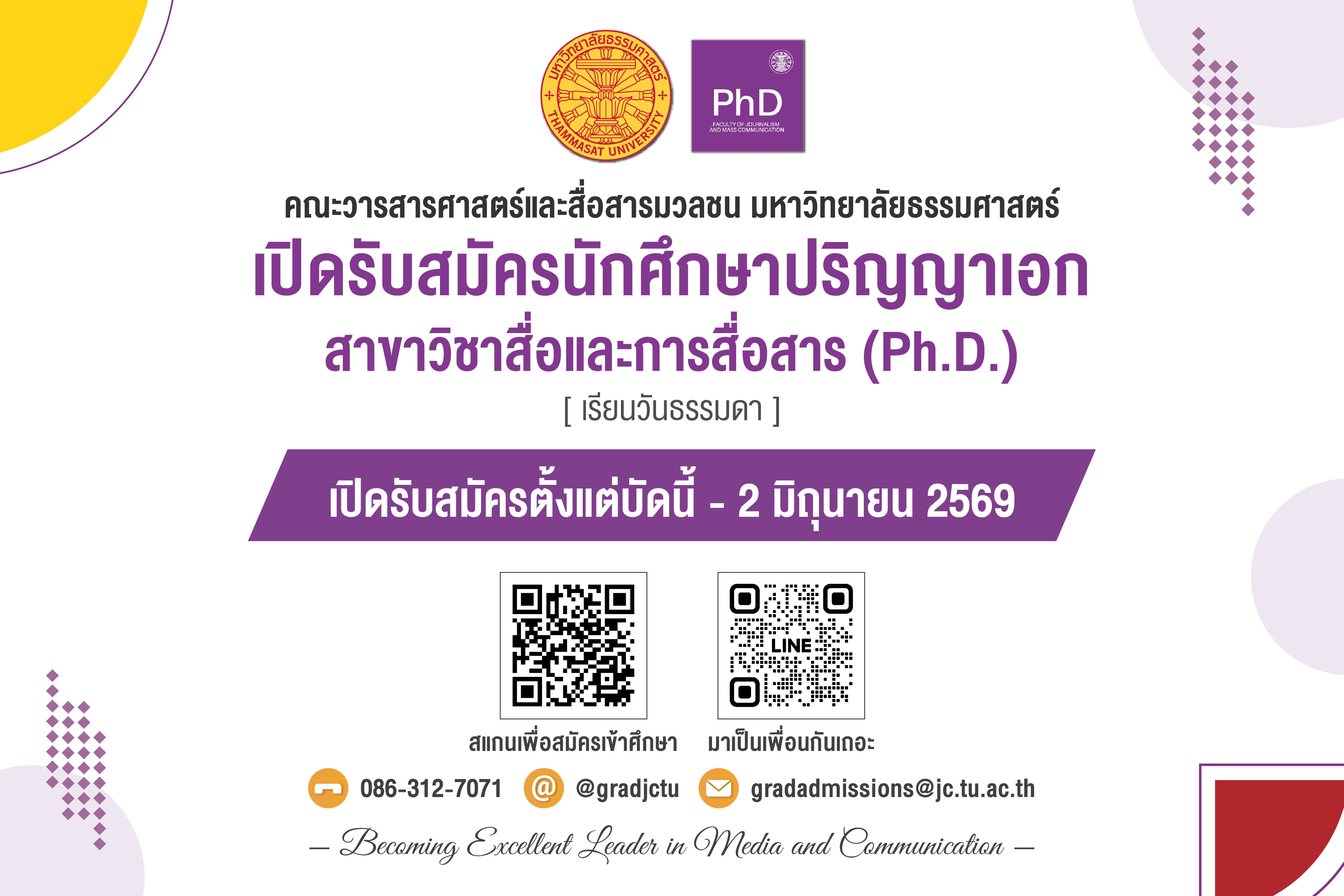 สอบถามข้อมูลเพิ่มเติม โทรศัพท์: 02-221-6111-20 ต่อ 390 , 3901, 3902 Mobile: 086-312-7071Line: @gradjctu