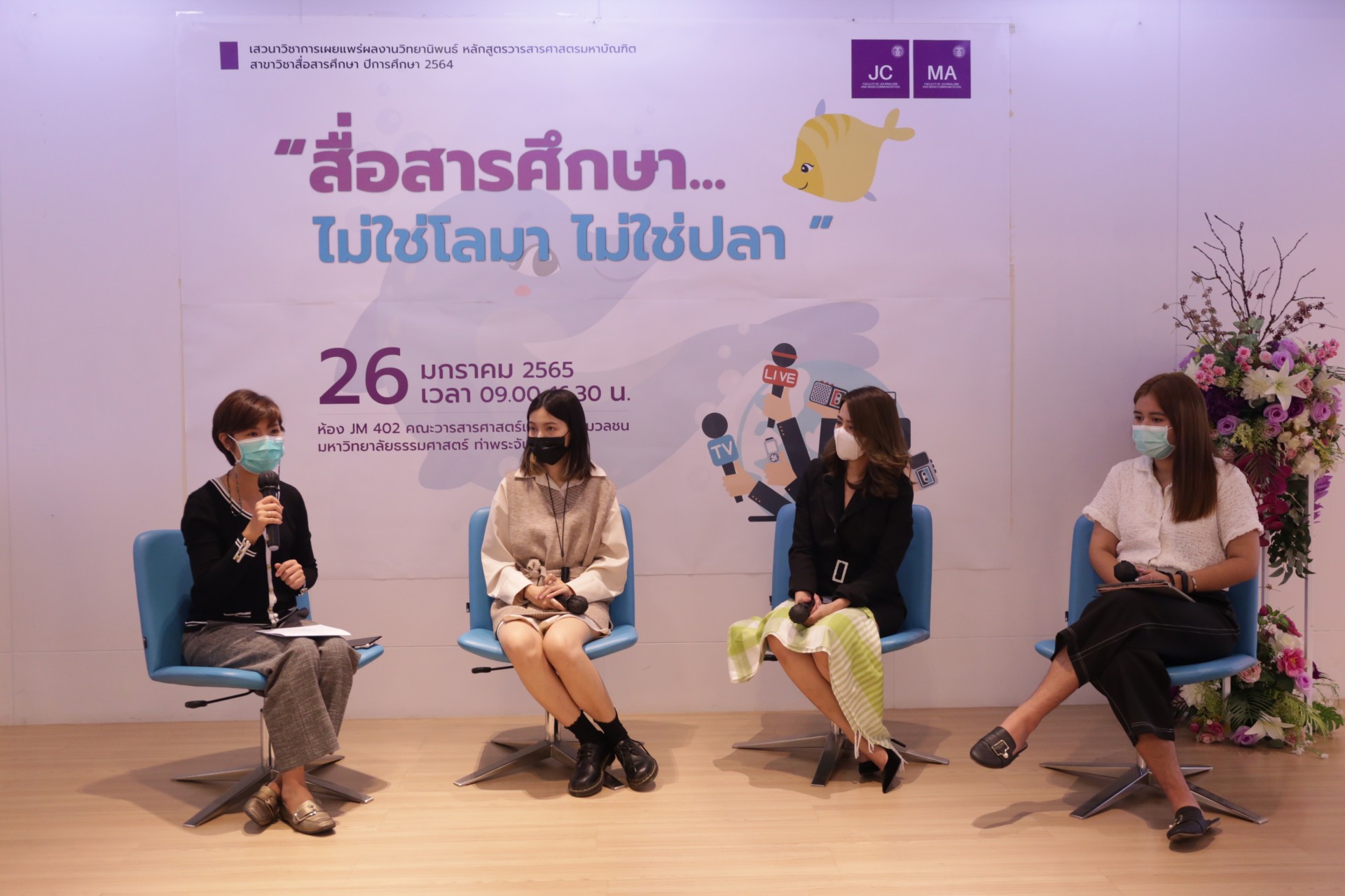 เมื่อวันที่ 26 มกราคม 2565 โครงการวารสารศาสตรมหาบัณฑิต สาขาสื่อสารศึกษา (MA) จัดงานเสวนาวิชาการและการเผยแพร่ผลงานวิทยานิพนธ์หลักสูตรวารสารศาสตรมหาบัณฑิต สาขาวิชาสื่อสารมวลชน ประจำปีการศึกษา 2564 ในหัวข้อ "สื่อสารศึกษา…ไม่ใช่โลมา ไม่ใช่ปลา” โดยมี รศ.กัลยกร วรกุลลัฎฐานีย์ คณบดีคณะวารสารศาสตร์และสื่อสารมวลชน พร้อมด้วย อ.ดร.ดวงแก้ว เธียรสวัสดิ์กิจ ผู้อำนวยการโครงการบัณฑิตศึกษา รศ.ดร.สมสุข หินวิมาน ประธานหลักสูตรวารสารศาสตรมหาบัณฑิต สาขาวิชาสื่อสารศึกษา (MA) และคณาจารย์ในคณะเข้าร่วมงาน ณ ห้อง JM 402 คณะวารสารศาสตร์ฯ มธ. ท่าพระจันทร์