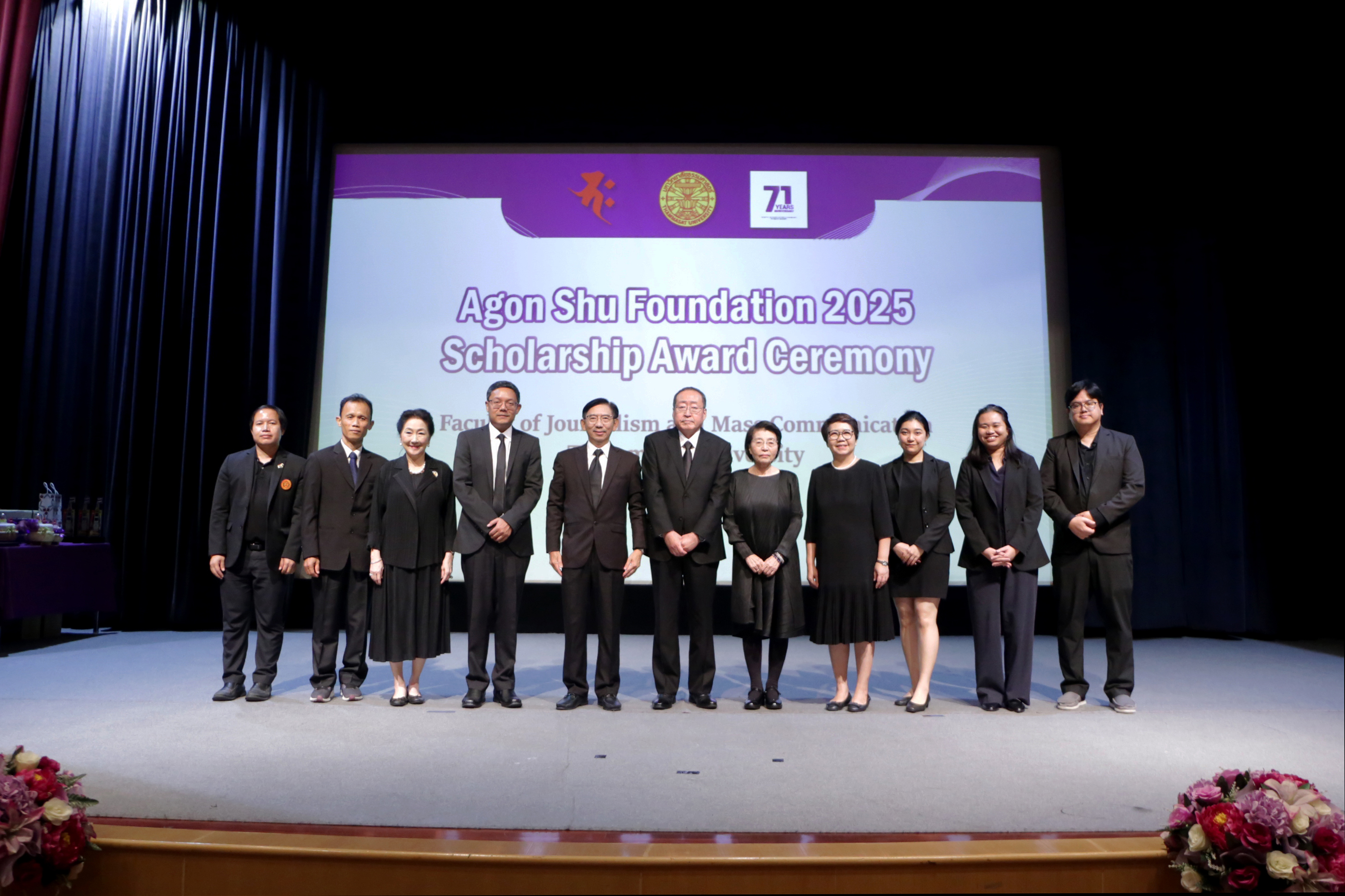 เมื่อวันที่ 13 พฤศจิกายน 2568 คณะวารสารศาสตร์และสื่อสารมวลชน มหาวิทยาลัยธรรมศาสตร์ จัดพิธีมอบทุนการศึกษา “มูลนิธิ Agon Shu” ประจำปีการศึกษา 2568 โดยได้รับเกียรติจาก Ms. Kazuko Maki, Director of Agon Shu International Department, Mr.Shimabukuro Masaru/Agon Shu Foundation, International Affairs และคุณผาณิต พูนศิริวงศ์ Agon Shu Coordinator พร้อมด้วย รศ.ดร.กิตติวัฒน์ จันทร์แจ่มใส รองอธิการบดีฝ่ายบริหารศูนย์ลำปางและการนักศึกษา ผู้แทนอธิการบดีมหาวิทยาลัยธรรมศาสตร์ กล่าวต้อนรับ โดยมี ผศ.ดร.ปกป้อง ส่องเมือง ผู้ประสานงาน มูลนิธิ Agon Shu ศ.ดร.สมคิด เลิศไพฑูรย์ อดีตอธิการบดีฯ ผศ.ดร.อัจฉรา ปัณฑรานุวงศ์ คณบดีคณะวารสารศาสตร์ฯ คณะผู้บริหาร คณาจารย์ และนักศึกษา เข้าร่วมงาน ณ โรงภาพยนตร์วารสารศาสตร์ คณะวารสารศาสตร์และสื่อสารมวลชน มหาวิทยาลัยธรรมศาสตร์ โดยในปีนี้ มีนักศึกษาจากคณะวารสารศาสตร์ฯ ได้รับทุนการศึกษาจากทางมูลนิธิ Agon Shu จำนวน 21 ทุน รวมเป็นเงินจำนวน 500,000 บาท จากจำนวนผู้สมัครขอรับทุนการศึกษาทั้งหมด จำนวน 63 คน
